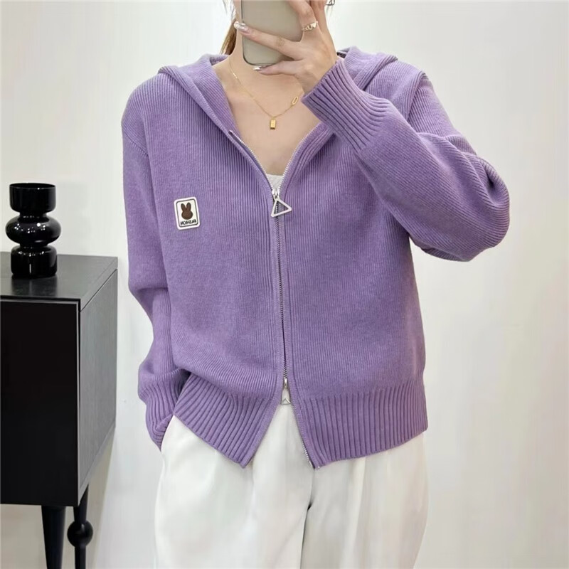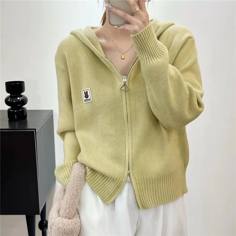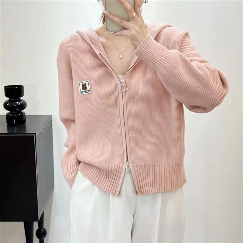 针织衫女秋冬新款复古法式纯色拉链兔子连帽针织开衫毛衣